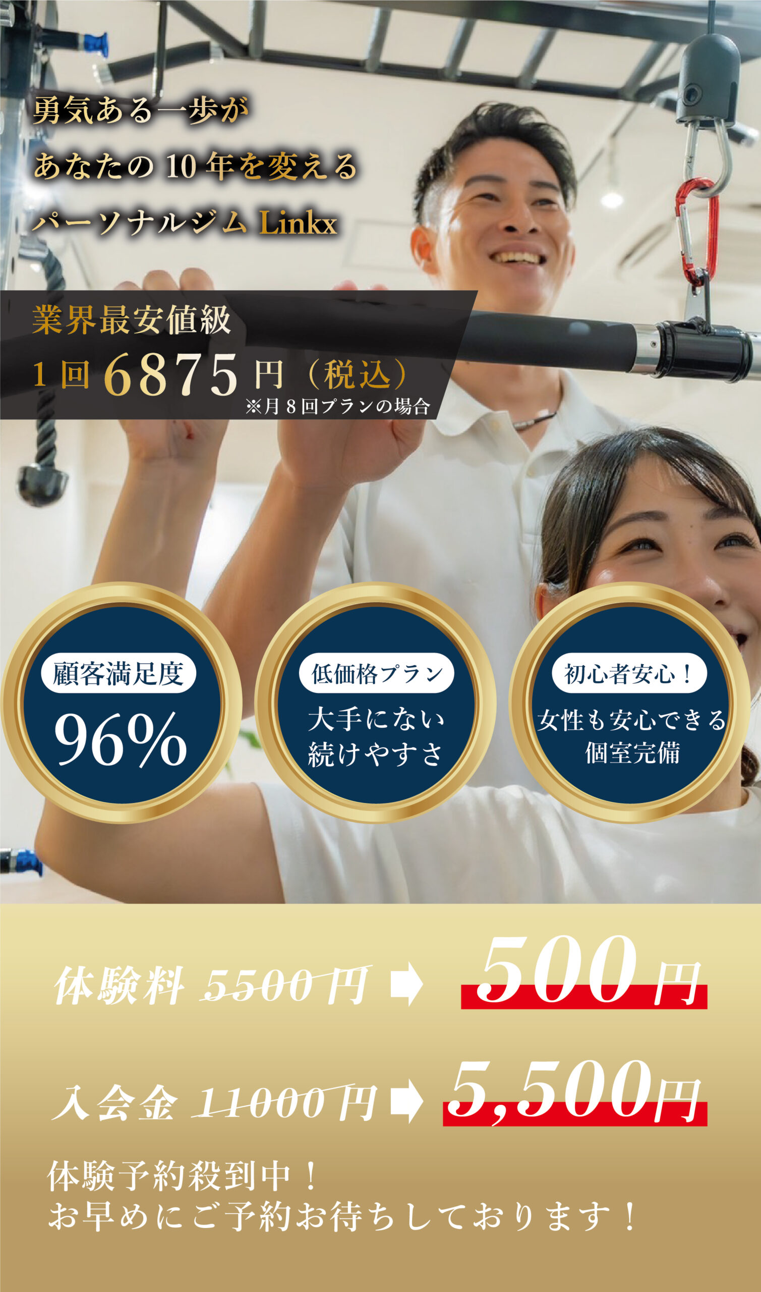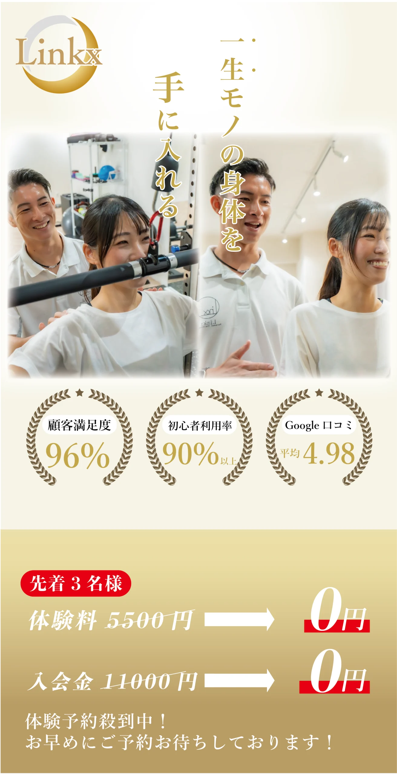 大丈夫です。Linkx GYMに通っていただいているお客様のほとんどが筋トレ初心者です。不安な点は遠慮なくご相談ください。